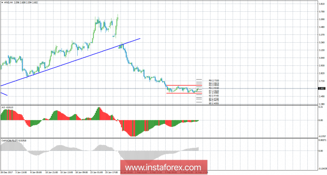 Технический анализ природного газа за 19 февраля 2018 годаИнстаФорекс - Instaforex, 7 лет назад 4-часовой таймфрейм Анализ: Цена на природный газ в пятницу, 16 февраля, продолжала оставаться на одном месте, волатильность остается практически нулевой. Так как восходящая линия тренда была преодолена, то сейчас по инструменту сохраняется нисходящая тенденция. Нисходящей линии тренда на данный момент нет, и вряд ли она будет построена в ближайшее время. Оба индикатора по-прежнему направлены наверх, разряжаясь, таким образом. Инструмент по-прежнему остается зажатым в узкий боковой коридор, из которого не может выбраться в последние дни. Торговые рекомендации: По инструменту #NG сейчас рекомендуется рассматривать шорты с целями 2,4730 и 2,4470. Стоп-лосс выставляется выше ближайшего уровня сопротивления. Рекомендуется выставить Stop Loss в зону безубытка при прибыльности сделки 800-1000 пунктов. Закрепление цены ниже нижней линии бокового коридора может указать на возобновление движения вниз. На сегодня нет запланированных отчетов, касающихся природного газа. Ордера на покупку сейчас не актуальны. Помимо технической картины следует также учитывать фундаментальные данные и время их выхода. Пояснения к иллюстрациям: Awesome Oscillator – красные и зеленые бары в окне индикаторов. OsMA – серые бары в окне индикаторов. Линии тренда – синие линии. Уровни поддержки и сопротивления – красные горизонтальные линии.Материал предоставлен компанией InstaForex - www.instaforex.com |
