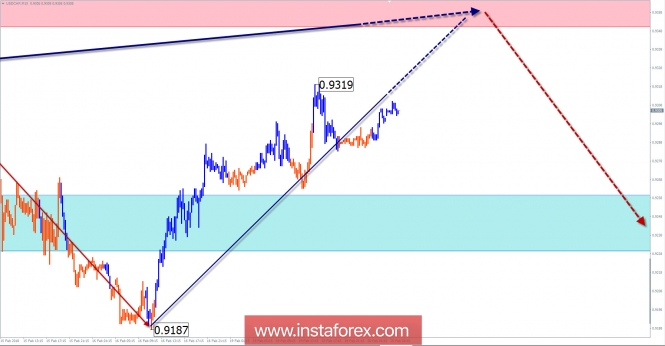 Торговый обзор на 20 февраля по упрощенному волновому анализуИнстаФорекс - Instaforex, 7 лет назад Обзор и прогноз по USD/CHF Котировки мажорной пары швейцарской валюты продолжают движение медвежьим курсом, заданным в конце 2016 года. Цена вплотную приблизилась к верхней границе очередной потенциальной зоны разворота, где вероятность смены направления движения цены резко возрастает. Речь о смене тренда не идет. Пока можно рассчитывать на коррекционный подъем в рамках последнего участка основной волны. Сегодня ожидается перемещение цены в боковом коридоре. В первой половине дня ценовой рост должен завершиться в рамках расчетного сопротивления. Ближе к концу суток повышается шанс смены вектора движения и ход цены вниз. Зона поддержки демонстрирует ожидаемый размах суточного хода пары. Границы зон сопротивления: - 0.9350/80 Границы зон поддержки: - 0.9260/30 Обзор и прогноз по EUR/JPY Крупная восходящая волна инструмента привела котировки кросса к контакту с нижним рубежом предварительной целевой зоны. Контакт цен с мощным уровнем спровоцировал смену курса движения. Анализ волновой структуры последних месяцев графика показывает формирование заключительной части скрытой медвежьей коррекции. Предварительный расчет вероятного хода вниз выдает около 2-х ценовых фигур до завершения всей волны. Наиболее вероятным направлением движения ближайших суток должен стать нисходящий курс. На европейской сессии не исключен кратковременный подъем цены, не далее расчетной зоны сопротивления. В районе ближайшей зоны поддержки ход пары вниз может на некоторое время застопориться. Границы зон сопротивления: - 132.60/90 Границы зон поддержки: - 131.80/50 - 131.20/130.90 Пояснения к рисункам: Для упрощенного волнового анализа используется простейший вид волны в виде зигзага, сочетающий в себе 3 части (А;В;С). Из таких волн состоят все виды коррекции и большая часть импульсов. На каждом тайм-фрейме анализируется последняя, незавершенная волна. Отмеченные на графиках зоны указывают расчетные участки, где вероятность смены направления движения значительно повышается. Стрелки указывают волновую разметку по используемой автором методике. Сплошным фоном стрелок указана сформированная структура, пунктирным – ожидаемые волновые движения. Внимание: Волновой алгоритм не учитывает продолжительность движений инструмента по времени. Прогноз не является торговым сигналом! Для проведения торговой сделки требуются подтверждающие сигналы используемых Вами торговых систем Материал предоставлен компанией InstaForex - www.instaforex.com |