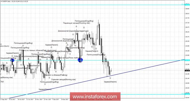 Свечной анализ EUR/JPY на 20 февраляИнстаФорекс - Instaforex, 7 лет назад 4h Новая бычья свечная формация «Просвет в облаках» позволила паре EUR/JPY выполнить разворот в пользу европейской валюты и начать процесс роста в направлении коррекционного уровня 100,0% - 133,03. Медвежьи формации «Харами» и «Падающая звезда» являются очень слабыми. Проход пика «Звезды» повысит вероятность продолжения роста. Образование 20 февраля новой медвежьей формации позволит рассчитывать на разворот в пользу валюты Японии и некоторое падение в направлении уровня коррекции 127,2% - 131,81. Закрепление курса пары под уровнем Фибо 127,2% сработает в пользу дальнейшего падения в направлении следующего уровня коррекции 161,8% - 130,28. Сетка Фибо построена по экстремумам от 11 января 2018 года и 2 февраля 2018 года. Daily На 24-часовом графике пара продолжает процесс падения в направлении уровня коррекции 161,8% - 129,81. Образование бычьей свечной формации «Харами» позволяет трейдерам ожидать разворот в пользу евровалюты и некоторый рост пары в направлении уровня Фибо 200,0% - 133,32. Закрепление котировок над уровнем коррекции 200,0% сработает в пользу продолжения роста пары в направлении следующего коррекционного уровня 261,8% - 139,05. Сетка Фибо построена по экстремумам от 15 декабря 2016 года и 17 апреля 2017 года. Материал предоставлен компанией InstaForex - www.instaforex.com |