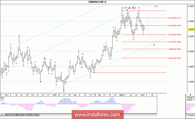 Волновой анализ валютной пары EUR/USD. Недельный обзорИнстаФорекс - Instaforex, 7 лет назад Анализ волновой разметки: Пробой максимума от 25 января (1,2535) спровоцировал в ходе торгов минувшей недели существенное падение цены по паре EUR/USD к отметке 1,2260. При этом можно предположить, что в связи с достижением (неделей ранее) отметки 1,2555, валютная пара перешла в стадию формирования первых образующих волн в составе будущей 5-й волны, в 5-й, в А, в (С). В то же время по-прежнему сохраняется вероятность значительного усложнения внутренней волновой структуры 4-й волны, в 5-й, в А, в (С) и развития нисходящего движения к уровню 22-й фигуры, или даже к нижней образующей линии восходящего канала. Цели для варианта с восходящей волной: 1,2532 – 200,0% по Фибоначчи 1,2600 – 1,3000 Цели для варианта с нисходящей волной: 1,2224 – 38,2% по Фибоначчи 1,2127 – 50,0% по Фибоначчи Общие выводы и торговые рекомендации: Инструмент продолжает построение повышательного участка тренда. Волна 4, в 5, в А, в (C) предположительно завершена. Если это действительно так, то повышение котировок возобновится в рамках волны 5, в 5, в А, в (C), расположенными около 26 фигуры и выше. Повышательный коридор сохраняет перспективы построения восходящего участка тренда. Понижательная волна 4 может усложнить свою внутреннюю структуру.Материал предоставлен компанией InstaForex - www.instaforex.com |