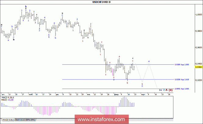 Волновой анализ валютной пары USD/CHF. Недельный обзорИнстаФорекс - Instaforex, 7 лет назад Анализ волновой разметки: Тестирование ранее уровня 92-й фигуры спровоцировало в ходе торгов минувшей недели отскок цены по паре USD/CHF к уровню 0,9400. Сложившаяся при этом волновая ситуация позволяет предполагать, что валютная пара осталась в стадии формирования значительно усложнившей свою волновую структуру 4-й волны, в 3-й, в 3-й, в с, во 2-й, в A, в (В). Если это так, то валютная пара может возобновить снижение котировок к уровню 0,9200 и все же завершить 3-ю волну, в 3-й, в с, во 2-й, в A, в (В). Цели для отработки варианта с нисходящей волной: 0,9208 – 261,8% по Фибоначчи 0,9095 – 300,0 по Фибоначчи Цели для отработки варианта с восходящей волной: 0,9700 – 0,9800 Общие выводы и торговые рекомендации: Волновая разметка понесла некоторый уточнения. Понижение котировок может возобновиться на этой неделе с целями, расположенными вблизи расчетных отметок 0,9208 и 0,9095, что приравнивается к 261,8% и 300,0% по Фибоначчи, в рамках волны 3, в с, во 2, в А, в (В). После завершения построения этой волны возможен отход от достигнутых минимумов в рамках волны 4, в с.Материал предоставлен компанией InstaForex - www.instaforex.com |