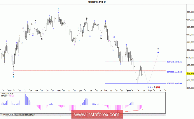 Волновой анализ валютной пары USD/JPY. Недельный обзорИнстаФорекс - Instaforex, 7 лет назад Анализ волновой разметки: Не сумев развить обозначившееся было восходящее движение, до конца минувшей недели пара USD/JPY откатилась к отметке 106,50 от достигнутого в среду локального максимума (107,90). При этом можно предположить, что в результате такого снижения валютная пара может перейти в завершающую стадию формирования 5-й волны, в 3-й волны, в с, в В, в (В) и придать ей более убедительный вид. Если это так, то прежде чем обозначить начало будущей 4-й волны, в с, в В, в (В), валютная пара может продолжить снижение котировок и обновить уже достигнутый 16 февраля минимум (105,55). Цели для варианта с построением нисходящей волны: 105,59 – 200,0% по Фибоначчи 104,00 Цели для варианта с построением восходящей волны: 108,42 – 127,2% по Фибоначчи 110,00 Общие выводы и торговые рекомендации: Пара USD/JPY продолжает построение предполагаемой волны (С). Таким образом, понижение котировок может продолжиться в рамках волны 3, в с, в В, в (В) с целями, находящимися около расчетной отметки 105,59, что приравнивается к 200,0% по Фибоначчи, и ниже, около 104 фигуры. Конвергенция MACD_ака предупреждает о готовности инструмента к построению восходящей волны 4.Материал предоставлен компанией InstaForex - www.instaforex.com |