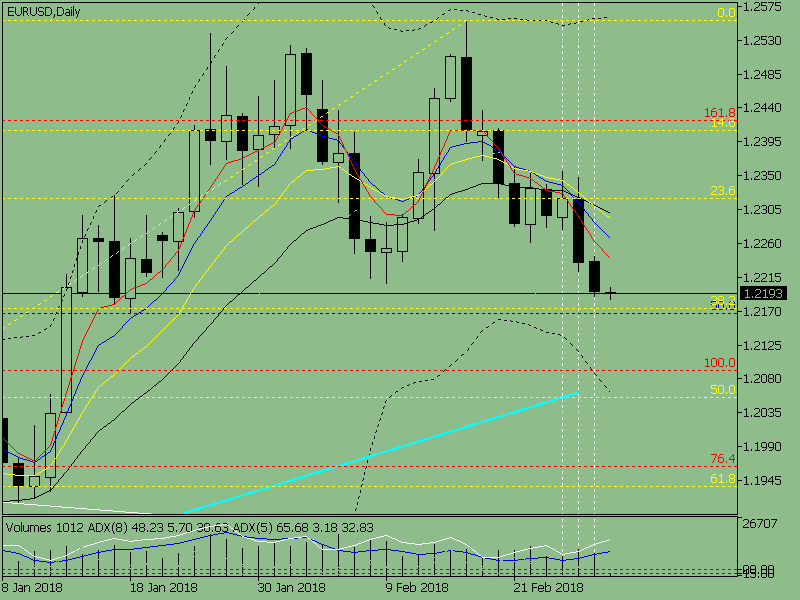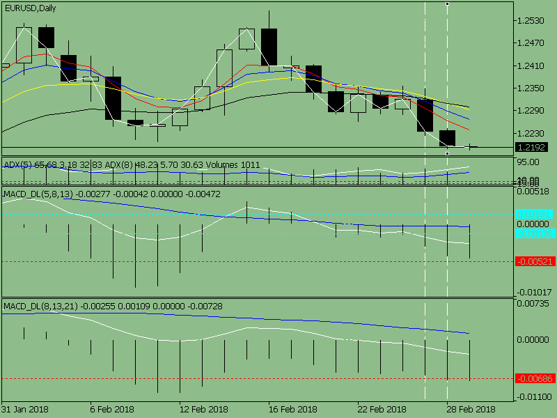 Индикаторный анализ. Дневной обзор на 1 марта 2018 по парам EUR/USDИнстаФорекс - Instaforex, 7 лет назад В четверг выходят следующие сильные календарные новости: - 11.55 мск. EUR, индекс деловой активности в производственном секторе (PMI) Германии (фев.), ждут 60.3, предыдущее значение 60.3; - 18.00 мск. USD, выступление главы ФРС г-на Пауэлла; - 18.00 мск. USD, индекс деловой активности в производственном секторе (PMI) от ISM (фев.), ждут 59.0, предыдущее значение 59.1; - 18.30 мск. USD, запасы сырой нефти, ждут 2.675М, предыдущее значение -1.616М. Трендовый анализ (рис. 1) В среду рынок двигался вниз, согласно недельному тренду. Цена, двигаясь вниз, так и не достигла откатного уровня 38.2% 1.2173. В четверг возможно продолжение нижнего движения, с достижением этого уровня. Комплексный анализ более точно расскажет, куда пойдёт цена.