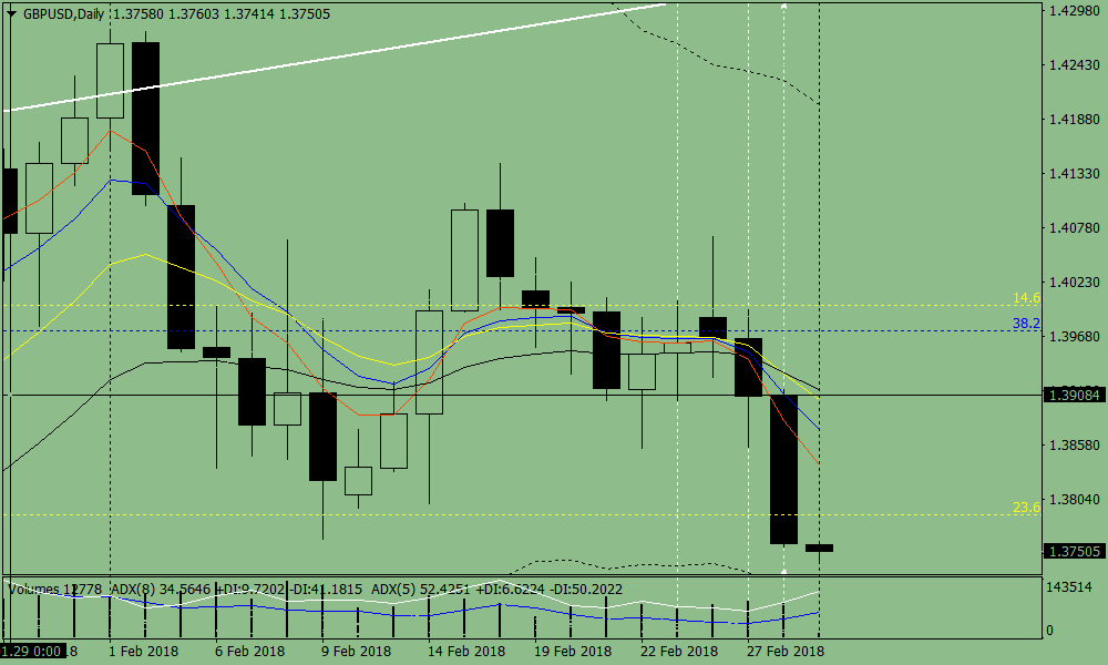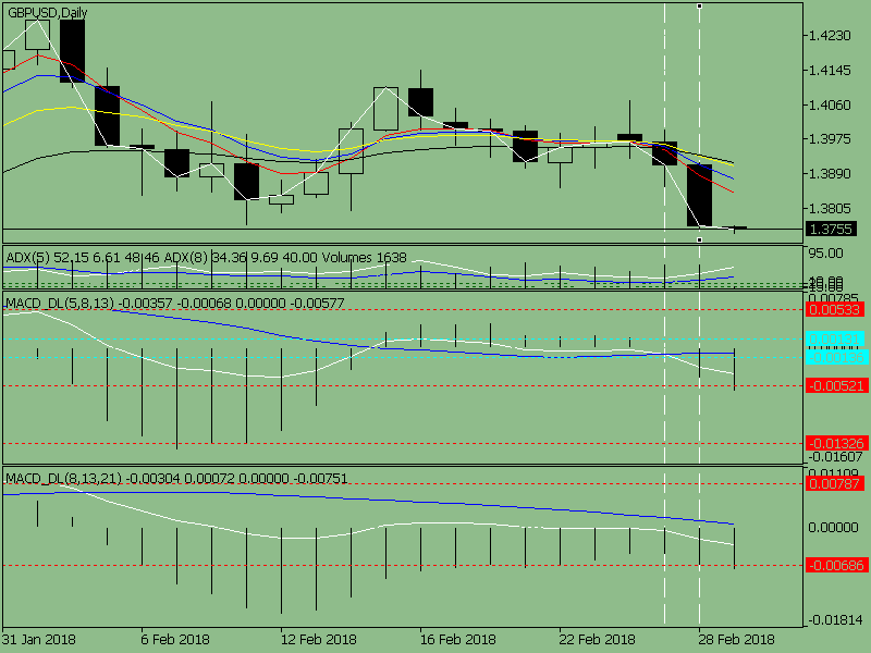 Индикаторный анализ. Дневной обзор на 1 марта 2018 по паре GBP/USDИнстаФорекс - Instaforex, 7 лет назад - 12.30 мск. GBP, индекс деловой активности в производственном секторе (PMI) (фев.), ждут 1.2%, предыдущее значение 1.3%; - 18.00 мск. USD, выступление главы ФРС г-на Пауэлла; - 18.00 мск. USD, индекс деловой активности в производственном секторе (PMI) от ISM (фев.), ждут 59.0, предыдущее значение 59.1; - 18.30 мск. USD, запасы сырой нефти, ждут 2.675М, предыдущее значение -1.616М. Трендовый анализ (рис. 1) В среду цена двигалась вниз, согласно недельному тренду. Рынок в четверг может продолжить движение вниз, с первой целью 1.3684 – нижняя граница линий Боллинджера. Комплексный анализ более точно расскажет, куда пойдёт цена.