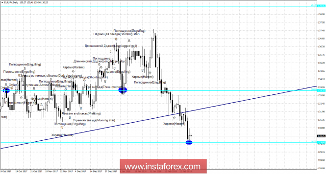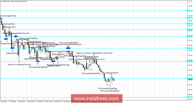 Свечной анализ EUR/JPY на 2 мартаИнстаФорекс - Instaforex, 7 лет назад 4h Две бычьи формации «Поглощение», образовавшиеся на 4-часовом графике, не помогли паре EUR/JPY начать процесс роста. После образования медвежьей свечной формации «Харами» котировки выполнили возврат под уровень коррекции 161,8% - 130,28, что позволяет теперь рассчитывать на возобновление падения в направлении коррекционного уровня 200,0% - 128,55. Образование новой бычьей формации вновь позволит трейдерам ожидать разворот в пользу валюты ЕС и некоторый рост. Закрепление курса над уровнем Фибо 161,8% аналогично сработает в пользу начала роста котировок. Сетка Фибо построена по экстремумам от 11 января 2018 года и 2 февраля 2018 года. Daily На 24-часовом графике пара выполнила падение к уровню коррекции 161,8% - 129,81. Отбой котировок от уровня Фибо 161,8% позволяет трейдерам рассчитывать на разворот в пользу евровалюты и некоторый рост в направлении коррекционного уровня 200,0% - 133,32. Образование бычьей свечной формации повысит шансы пары на отбой от уровня коррекции 161,8%. Закрепление пары под уровнем Фибо 161,8% сработает в пользу дальнейшего падения в направлении следующего коррекционного уровня 127,2% - 126,61. Сетка Фибо построена по экстремумам от 15 декабря 2016 года и 17 апреля 2017 года. Материал предоставлен компанией InstaForex - www.instaforex.com |