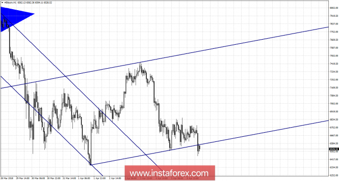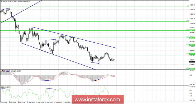 Графический анализ #Bitcoin на 6 апреля.ИнстаФорекс - Instaforex, 7 лет назад Курс биткоина продолжает падать и уже в ближайшее время может обновить свой предыдущий локальный минимум. По-прежнему никаких новостей и сообщений, которые могли бы поддержать котировки «битка» и вызвать новую волну спроса, нет. Более того, продолжают поступать негативные новости. Так, например, глава пятой по величине биржи криптовалют в Южной Корее Coinnest Ким Ик Хван был задержан по обвинениям в мошенничестве. В совокупности со вчерашними новостями о том, что многие хедж-фонды, работающие с криптовалютами, начали испытывать серьезные финансовые проблемы, биткоин вполне логично продолжает падать вместе со многими другими криптовалютами. Сейчас перспективы «битка» по-прежнему выглядят весьма туманно. Бум биткоина уже явно прошел, и для того чтобы он снова начал расти, нужны не просто ожидания его роста, а конкретные причины. Закрепление котировок под уровнем коррекции 76,4% - 7 249$ позволило котировкам возобновить процесс падения в направлении коррекционного уровня 100,0% - 5 853$. Новых назревающих дивергенций не наблюдается. Сетка Фибо построена по экстремумам от 6 февраля 2018 года и 21 февраля 2018 года. На часовом графике построен новый графический паттерн – равноудаленный канал с направлением «вверх». Однако котировки уже вышли через его нижнюю границу, что повышает вероятность дальнейшего падения. Торговые рекомендации: Покупки #Bitcoin можно будет рассматривать с целью 8 093$ и ордером, ограничивающим возможные убытки, под уровнем Фибо 76,4%, если произойдет закрытие над уровнем коррекции 7 249$. Продавать #Bitcoin можно с целью 5 853$, так как попытка закрытия над уровнем Фибо 76,4% оказалась неудачной. Материал предоставлен компанией InstaForex - www.instaforex.com |