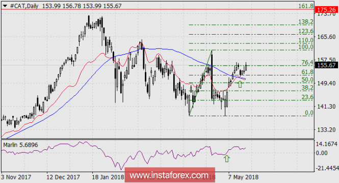 На текущий момент мы наблюдаем подтверждение третичного сигнала в покупку акций компании Caterpillar. Предварительный сигнал был в момент пересечения осцилляторной линии индикатора Марлин над нулевую линию (7 мая). Во второй раз это был выход цены над голубую линию сопротивления ценового индикатора линии Крузенштерна. Зелёной стрелкой на графике отмечен третий сигнал, подтверждающий второй – отскок цены от линии Крузенштерна вверх. Также можно заметить, что цена развернулась от красной линии на графике – это балансная линия цены. При нахождении цены выше данной линии выбираются моменты для покупок, при нахождении цены под ней – в продажу.