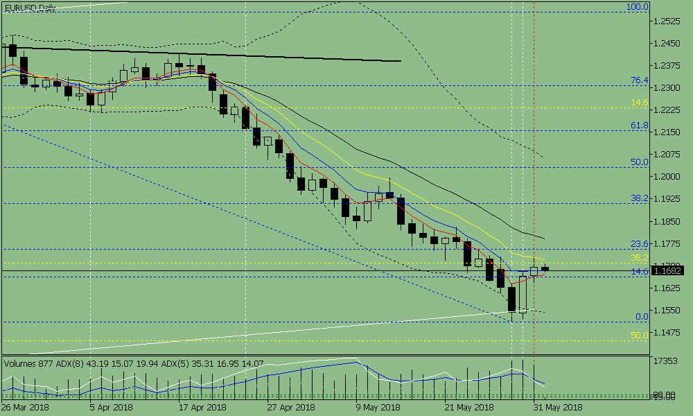 Индикаторный анализ. Дневной обзор на 1 июня 2018 по паре EUR/USDИнстаФорекс - Instaforex, 7 лет назад В пятницу выходят следующие сильные календарные новости: - 10.55 мск. EUR, индекс деловой активности в производственном секторе (PMI) Германии (май), ждут 56.8, предыдущее значение 56.8; - 15.30 мск. USD, изменение числа занятых в несельскохозяйственном секторе (май), ждут 189К, предыдущее значение 168К; - 15.30 мск. USD, уровень безработицы (май), ждут 3.9%, предыдущее значение 3.9%; - 17.00 мск. USD, индекс деловой активности в производственном секторе (PMI) от ISM (май), ждут 58.2, предыдущее значение 57.3. Трендовый анализ (рис. 1). В четверг цена, как и предполагалось, после достижения откатного уровня 14.6% 1.664 (синяя пунктирная линия) продолжила движение вверх, но сильные новости вернули рынок практически к моменту открытия рабочего дня. В пятницу, вероятнее всего, до сильных новостей (15.30 мск) движение будет боковым. Комплексный анализ более точно расскажет, куда пойдёт цена. Рис. 1 (дневной график). Индикаторный анализ по дневному графику (рис. 2). Система индикаторов ADX (рис. 1). На последнем прогоне быстрая линия (индикатор периодом 5 – белая) и медленная линия (индикатор периодом 8 – синяя) двигались вниз. В этом случае тенденцию нужно определять по индикаторам осцилляторного типа. Комплексный анализ: - индикаторный анализ – вверх; - уровни Фибоначчи – вверх; - объёмы – вверх; - свечной анализ – вверх; - трендовый анализ – вверх; - линии Боллинджера – вверх; - недельный график - вниз. Общий вывод. В пятницу рынок будет двигаться вверх, с первой целью 1.1757 – откатный уровень 23.6% (синяя пунктирная линия). Материал предоставлен компанией InstaForex - www.instaforex.com |