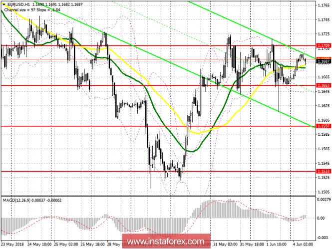 Торговый план на европейскую сессию 4 июня EUR/USDИнстаФорекс - Instaforex, 7 лет назад Для открытия длинных позиций по EURUSD требуется: Рассматривать покупки евро можно после прорыва и закрепления на сопротивлении 1.1709, что открывает возможность по дальнейшей восходящей коррекции в районы 1.1775 и 1.1828, где рекомендую фиксировать прибыль. Формирование ложного пробоя поддержки 1.1653 также будет дополнительным сигналом к покупкам. В ином случае открывать длинные позиции можно на отскок от 1.1597. Для открытия коротких позиций по EURUSD требуется: Неудачное закрепление выше 1.1709 с возвратом под этот уровень будет первым сигналом к открытию коротких позиций в евро с основной целью возврата под уровень поддержки 1.1653, где давление на пару возрастет еще больше, что приведет к крупной области 1.1597, где рекомендую фиксировать прибыль. В случае роста выше 1.1709 в первой половине дня, продажи можно поискать от уровней 1.1775 и 1.1828. Описание индикаторов