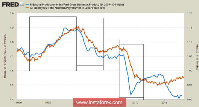 Торговые войны – неизбежность нового времениИнстаФорекс - Instaforex, 7 лет назад Доллар США открывает новую неделю уверенным ростом, отрабатывая не только растущий разрыв в монетарных политиках ЕЦБ и ФРС, но и готовясь к началу полномасштабной торговой войны «США против всех», угроза которой на текущий момент высока как никогда. Мы уже неоднократно отмечали, что торговые войны Трампа – явление совершенно неизбежное в текущих условиях, несмотря на победные реляции о силе американской экономики и на улучшение макроэкономических прогнозов ФРС, обосновывающее ускорение темпов нормализации монетарной политики. На графике ниже – две ключевые закономерности, описывающее экономическое состояние США. Одна из них отражает долю промышленного производства в структуре ВВП и она показывает, что состояние реального сектора экономики не просто плохое, оно катастрофичное. Рост реального сектора был завешен еще в 2000г, незадолго до того как активы устремились в набирающий силу пузырь «домкомов», и на текущий момент нет никаких признаков исправления ситуации. В мае 2018г. объем промышленного производства вновь снизился на 0.1%, а потому весь рост ВВП, на который ссылается ФРС, состоит исключительно из роста сектора услуг. Второй критерий – это соотношение количества новых рабочих мест, создаваемых американской экономикой, к количеству граждан, выпадающих из состава рабочей силы. В настоящее время безработица в США всего 3.8%, ФРС ожидает снижения в ближайший год до 3.6%, что фактически соответствует критериям полной занятости. Однако реальное соотношение работающих к неработающим хуже, чем было до кризиса 2008г и гораздо хуже, чем в 2000г, оставаясь на исторически минимальном уровне. Дело здесь не в демографии, дело в лукавой статистике, позволяющей выводить за пределы рабочей силы значительную часть работоспособного населения, не только не имеющего работы, но и отчаявшегося её когда-либо найти. На сегодняшний день реальный сектор не способен создавать рабочие места, а экономика США не сможет сохранить доминирующее положение в мире без решительных действий по изменению структуры ВВП, постиндустриальное общество не выдерживает ценовой конкуренции с азиатскими странами, и попытка закрыть свой рынок от дешевого импорта – неизбежный шаг в борьбе за новую индустриализацию США. Трамп делает то, что может спасти американскую экономику, а потому его действия последовательны логичны и не могут быть отменены. Торговым партнерам США нужно оставить иллюзию, будто бы они могут выторговать себе какие-либо привилегированные условия – это попросту невозможно. В этом свете политика ФРС явно направлена на укрепление доллара. Кроме того, что ФРС ужесточает темпы роста ставки и сокращает баланс, она занята еще одним процессом, на котором внимание не акцентируется – попыткой мягко избавиться от избыточных резервов банков. На последнем заседании ФРС повысила ставку по избыточным резервам не на 0.25%, а всего на 0.2%, сократив тем самым доходность банков при размещении средств на корсчетах ФРС, и, вероятнее всего будет сокращать доходность от размещения и далее. Таким образом ФРС намерена заставить банки взять на себя часть ответственности по финансированию долга правительства, ведь должен же кто-то выкупать трежерис, если сама ФРС этого делать больше не намерен