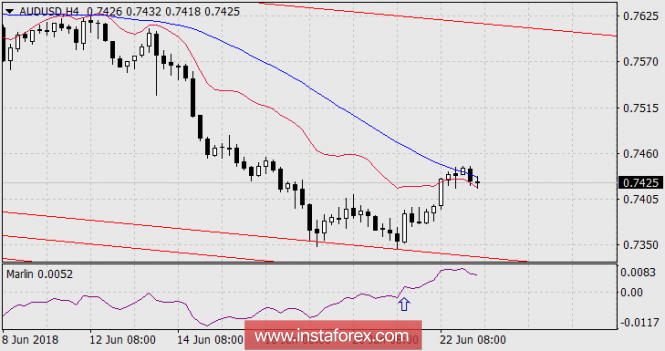 На графике Н4 цена не смогла закрепиться над голубой линией Крузенштерна, что может протолкнуть цену обратно под балансовую линию. В этом случае выход сигнальной линии осциллятора Марлин в положительную зону (отмечен стрелкой) может быть завершённым. Для возврата цены под балансовую линию и индикатора Марлин в отрицательную зону (зону снижения) потребуется время и усилия рынка. Данное усилие может выразиться в горизонтальном тренде. Снижение цены к поддержке трендовой линии (0.7327) может занять трое суток.