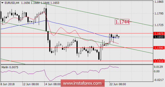 Технически цена успела зафиксироваться над голубой линией Крузенштерна и сигнальная линия Марлин в положительной зоне значений. Для усиления коррекционного роста цене необходимо закрепиться над новым уровнем 1.1675, тогда откроется цель 1.1744 – сопротивление верхней границы ценового канала. Для этого должна ухудшиться внешняя обстановка по доллару, но сегодня публикуются продажи новых домов в США за май, консенсус-прогноз предполагает рост до 665 тыс с 662 тыс. В Германии индекс настроений в деловых кругах Ifo за июнь ожидается понижением с 102,2 до 101,9.