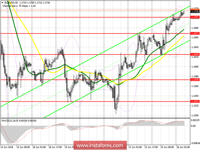 Торговый план на европейскую сессию 26 июня EUR/USDИнстаФорекс - Instaforex, 7 лет назад Для открытия длинных позиций по EURUSD требуется: Пока торговля ведется выше уровня 1.1707, спрос на евро будет сохраняться. Формирование ложного пробоя этого диапазона и возврат на него будет хорошим сигналом к покупкам евро. В случае снижения под этот уровень в первой половине дня, к длинным позициям лучше всего возвращаться при тесте 1.1673 либо на отскок от 1.1630. Основной целью покупателей будут уровни 1.1742 и 1.1778. Для открытия коротких позиций по EURUSD требуется: Возврат под уровень 1.1707 будет первым сигналом к продажам евро с целью более крупного снижения в район поддержки 1.1673. Основной целью продавцов будет нижняя граница бокового канала 1.1630, где рекомендую фиксировать прибыль. В случае дальнейшего роста EUR/USD, короткие позиции лучше всего поискать после ложного пробоя на 1.1742 либо на отскок от 1.1778. Описание индикаторов
