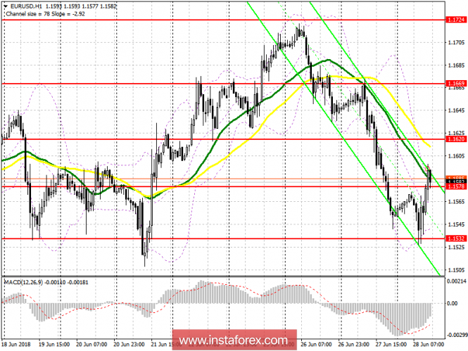 Торговый план на американскую сессию 28 июня EUR/USDИнстаФорекс - Instaforex, 7 лет назад Для открытия длинных позиций по EURUSD требуется: Покупатели отлично справились с уровнями, которые я обозначал в своём утреннем прогнозе, и сейчас пытаются зацепиться за сопротивление 1.1578, которое во второй половине дня может выполнить роль поддержки, что придаст силу восходящему импульсу, с целью обновления сопротивления 1.1620, где рекомендую фиксировать прибыль. В случае возврата EUR/USD под уровень поддержки 1.1578 во второй половине дня, возвращаться к покупкам лучше всего на отскок от 1.1532. Для открытия коротких позиций по EURUSD требуется: Медведям ничего не остается, как постараться вернуться под уровень 1.1578, ниже которого последует фиксация прибыли по длинным позициям, что приведет к снижению EUR/USD в район минимумов дня к поддержке 1.1532. В случае дальнейшего роста, продавать евро можно после ложного пробоя на 1.1620, либо на отскок от 1.1669. Описание индикаторов
