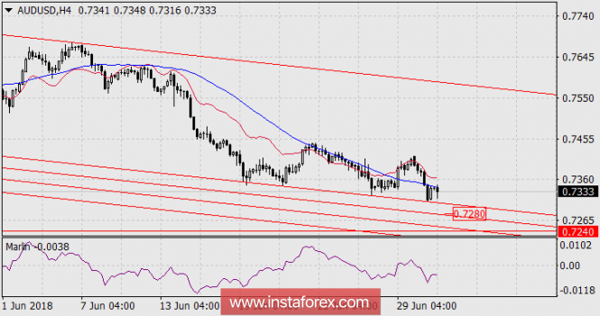 В итоге ждём снижение «австралийца» под дальнейшим давлением американского доллара последовательно к трендовым линиям поддержки: 0.7280, 0.7240, 0.7200.