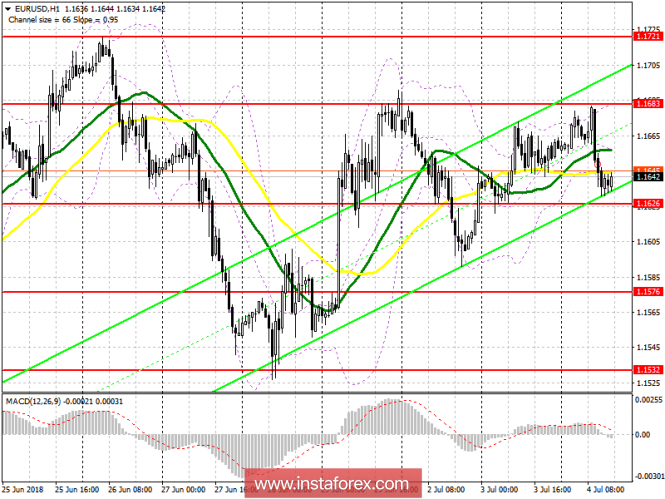 Торговый план на американскую сессию 4 июля EUR/USDИнстаФорекс - Instaforex, 7 лет назад Для открытия длинных позиций по EURUSD требуется: Во второй половине дня ряд бирж закрыт в связи с выходным днем в США. Волатильность будет очень низкая. Сигналом на покупку будет лишь ложный пробой и возврат на поддержку 1.1626 либо отскок от уровня 1.1576. Основной целью покупателей будет обновление сопротивления 1.1683, где рекомендую фиксировать прибыль. Для открытия коротких позиций по EURUSD требуется: Рассматривать новые продажи евро лучше всего после повторной коррекции к уровню сопротивления 1.1683 либо после закрепления ниже поддержки 1.1626, что открывает прямую дорогу в район нового минимума 1.1576, где рекомендую фиксировать прибыль. Описание индикаторов