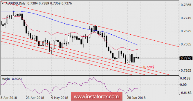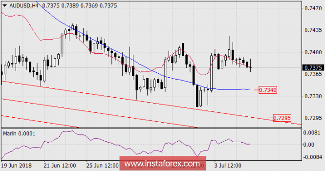 За прошедшие сутки сигнальная линия индикатора Марлин вплотную снизилась к нулевой линии и готовится перейти в отрицательную зону. Первой преградой цене для атаки на низлежащие трендовые линии является трендовая линия Крузенштерна (голубая) на цене 0.7340. Ожидающиеся позитивными американские данные по занятости помогут цене преодолеть эту и другие поддержки.