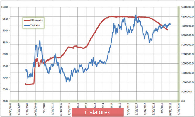 Попав под удар кризиса ликвидности на рынке РЕПО сделок, разразившегося в сентябре, ФРС под формальным предлогом повышения резервов коммерческих банков была вынуждена принять срочную программу покупок краткосрочных векселей правительства США на общую сумму 65 млрд долларов ежемесячно. Это как минимум уравнивает шансы доллара в соревновании печатных станков, если не увеличивает его преимущество. Однако правда заключается в том, что политика количественного смягчения не оказывает влияния на курс валюты, по крайней мере в той степени, как нам этого бы хотелось. Доказательства вы можете посмотреть на графике (рис.1), где представлена динамика движения торгово-взвешенного индекса доллара США, рассчитываемого ФРС по итогам торгового оборота с ведущими мировыми валютами.