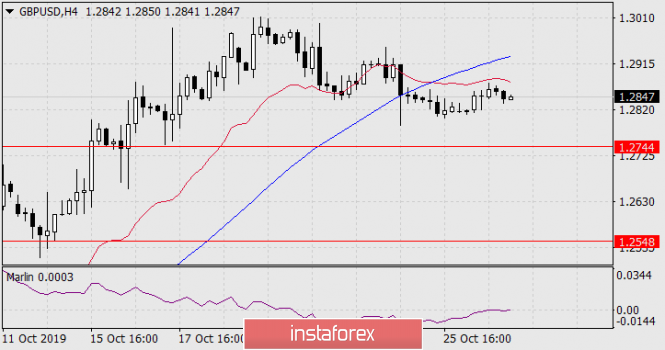 На четырёхчасовом графике цена развивается под индикаторными линиями баланса и Крузенштерна, сигнальная линия осциллятора Марлин движется по границе, разделяющей зону роста от зоны снижения тенденции. Сохраняется основной сценарий снижения фунта к 1.2744 с попыткой закрепления под ним.