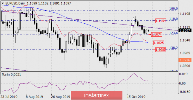 В понедельник евро откорректировал от поддержки уровня Фибоначчи 123,6% (1.1074) на 20 пунктов, но сохранил при этом понижающееся настроение. Движения осциллятора марлин в последние двое суток совпадают с движениями цены, что говорит о нейтральной выжидающей позиции рынка в преддверии завтрашнего заседания ФРС.