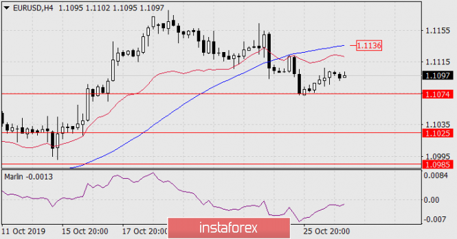 На четырёхчасовом графике цена по-прежнему ниже линий баланса (индикаторная красная) и Крузенштерна (индикаторная голубая) и здесь сигнальным уровнем выступает 1.1074, преодоление которого открывает дорогу к 1.1025 – линии Крузенштерна на дневном масштабе.
