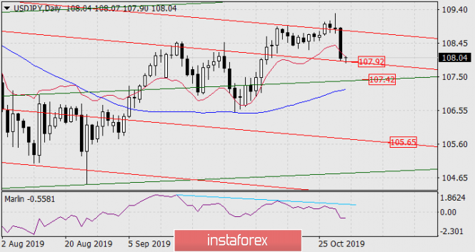 На дневном графике цена достигла поддержку красного ценового канала (107.92). Данное снижение раскрыло потенциал двойной конвергенции по осциллятору Марлин, его сигнальная линия закрепилась в зоне понижения тенденции.