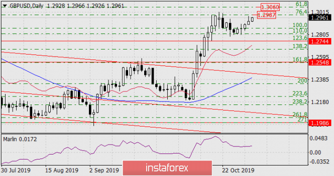 Текущая котировка GBP/USD близка к первой цели 1.2987, являющейся уровнем Фибоначчи 76,4%. Выход цены над уровень открывает вторую цель 1.3060. Цель может быть достигнута сегодня в случае выхода слабых данных по занятости в США за октябрь. Прогноз по новым рабочим местам вне сельскохозяйственного сектора составляет 90 тыс против 136 тыс в сентябре. Осциллятор Марлин разворачивается вверх в зоне роста.
