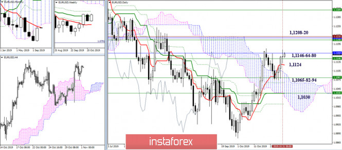 EUR/USD и GBP/USD 1 ноябряИнстаФорекс - Instaforex, 6 лет назад Экономический календарь (московское время) По сложившейся много лет назад традиции, первая пятница месяца предполагает публикацию важных данных из США. Сегодня время нон-фарма. 15:30 уровень безработицы + изменение числа занятых в несельскохозяйственном секторе. 17:00 индекс деловой активности в непроизводственном секторе. Также в ближайшее время ожидается публикация значимого показателя из Великобритании – индекс деловой активности в производственном секторе (12:30). Кроме этого, сегодня последний рабочий день перед выходными, поэтому актуален вопрос о том, смогут ли игроки на повышение сохранить оптимизм октября и закрыть текущую рабочую неделю не менее результативно. EUR/USD Можно подвести итоги за октябрь. Исполнена месячная восходящая коррекция до краткосрочного тренда. При закрытии месяца игроки на повышение справились с поставленной задачей, благодаря чему октябрьская свеча имеет явный бычий характер. Так как встречено сразу несколько сопротивлений, то ноябрьские планы и перспективы будут связаны с формированием результата взаимодействия. Если сила сопротивлений сейчас заставит игроков на повышение всё же взять паузу, предпосылки которой уже наметились в конце октября, то соперник попытается, в лучшем случае, сформировать отбой от встреченных уровней, в худшем нас ждёт торможение и консолидация в зоне влияния сопротивлений. С началом ноября сопротивления немного расширили зону влияния и сгруппировались на двух рубежах. Ближайшая зона сопротивления и притяжения является действующей, в настоящий момент она объединяет 1,1146 (недельный Киджун) – 1,1164 (месячный Тенкан) – 1,1180 (максимальный экстремум октября). Следующая наиболее важная зона сосредоточена в пределах 1,1208 – 1,1220 (нижняя граница месячного облака + заключительный рубеж недельного мёртвого креста + исторический уровень). Закрепление выше ставит перед собой такие задачи, как ликвидация недельного мёртвого креста и вход в месячное облако. В случае формирования отбоя от встреченных сопротивлений нас ждут поддержки, которые пока сохраняют своё расположение – 1,1124 (дневной Тенкан) – 1,1065-82-94 (дневное облако + недельный Фибо Киджун) – 1,1030 (дневной Киджун + недельный Тенкан). В настоящий момент техническое преимущество на младших таймах принадлежит игрокам на повышение. Ключевые уровни поддержки при развитии нисходящей коррекции сегодня расположены на 1,1153 (центральный Пивот-уровень) и 1,1117 (недельная долгосрочная тенденция). Для работы внутри дня сегодня рекомендованы классические Пивот-уровни сопротивления R1 (1,1175) – R2 (1,1197) – R3 (1,1219) и поддержки S1 (1,1131) – S2 (1,1109) – S3 (1,1087). GBP/USD В октябре месяце игроки на повышение исполнили коррекционный подъём, закрывшись выше месячного Фибо Киджуна (1,2882). Благодаря этому они сохранили высокие шансы на продолжение подъёма и развитие месячной восходящей коррекции, ориентирами данного движения в ноябре будут служить 1,3015 (недельное облако) – 1,3167 (месячный Киджун) – 1,3361 (нижняя граница месячного облака). В настоящий момент пара использует поддержку 1,2882-94 (месячный Фибо Киджун + дневной Тенкан), при этом продолжает оставаться в зоне дневной коррекции. Потеря поддержек способна спровоцировать медвежью активность и углубление дневного снижения. Ближайшим ориентиром южного направления про
