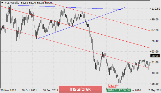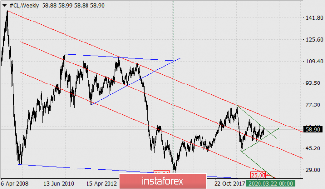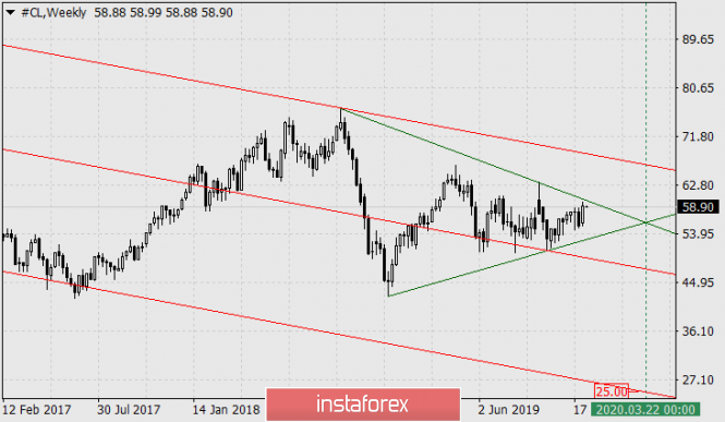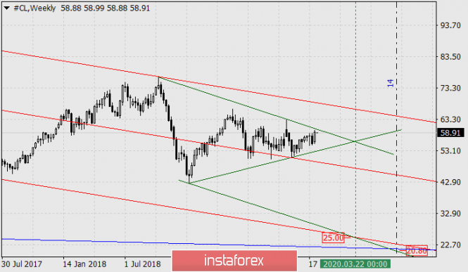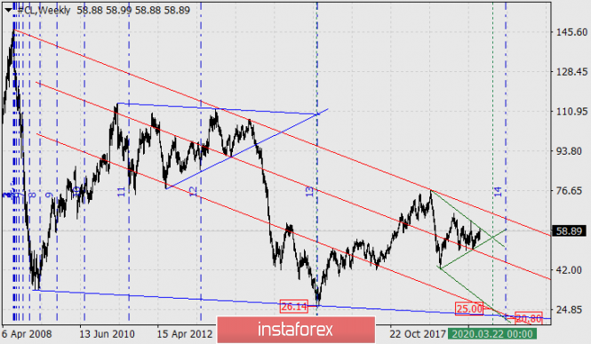 Нефть: долгосрочный прогнозИнстаФорекс - Instaforex, 5 лет назад Нефть - CL С апреля 2011 года до августа 2014 года цена на нефть (WTI) формировала протяжённую треугольную графическую формацию. В августе 2014-го года цена вышла из треугольника вниз и стремительно падала до января 2016 года, достигнув отметки 26.14. Падение нефти по выходу из треугольника продолжалось 75 недель, ровно до той временной точки, где сходятся образующие треугольник линии. От минимума 26.14 начался новый жизненный цикл рынка «рост-снижение». Наша задача определить завершение нового рыночного цикла. Сейчас мы видим, что цена вновь сформировала треугольник, но уже меньшего размера. Выход цены из треугольника вниз (ведь цена во второй фазе жизненного цикла рынка – в снижении) может спровоцировать 16-недельное падение до конца марта будущего года. Верхняя образующая линия большого треугольника при её параллельном переносе вниз к минимуму февраля 2009 года в точности совпадает с минимумом января 2016-го. Параллельная линия от образующей малого треугольника в точности совпадает в точке с его временной вершиной и линией ценового канала красного цвета. В точке схождения линий цена соответствует 25.00 долларов. Это та магнитная точка, к которой и стремится цена. Определяем временной диапазон (дельту времени) снижения с помощью временных зон Фибоначчи. За исходную точку принимаем исторический пик рынка в июле 2008 года. В точности на 13-й линии завершился предшествующий жизненный цикл рынка, следующая, 14-я линия указывает на середину июля 2020 года. Цена, соответственно, чуть ниже – 20.80 долларов за баррель. Итак, летом будущего года цена на нефть может стать ещё дешевле, чем она была в разгар мирового кризиса 2008 года и бума добычи сланцевой нефти в США на фоне «кризиса ОПЕК» 2016 года, целевой диапазон 20.80-25.00. Материал предоставлен компанией InstaForex - www.instaforex.com |