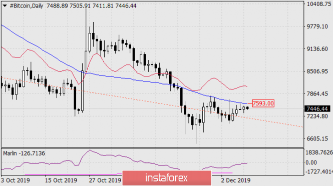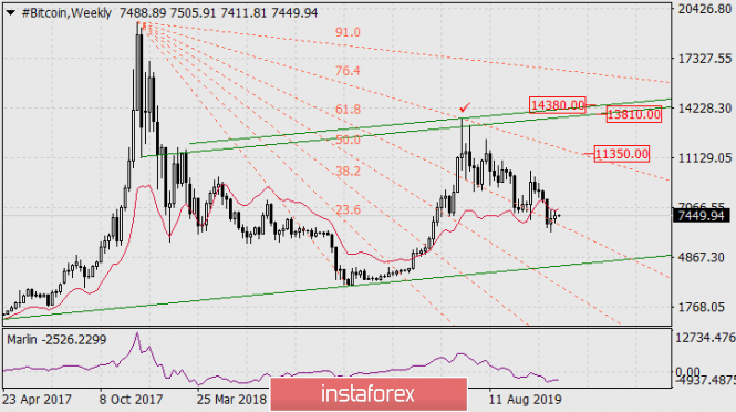Bitcoin – долгосрочный прогнозИнстаФорекс - Instaforex, 5 лет назад Bitcoin Первой серьёзной целью биткоина станет луч Фибоначчи 76,4% в районе цены 11350, причём этот луч является трендовой линией (точнее совпадает с этой линией) по вершинам пиков декабря 2017 года и июня 2019 года (отмечен галочкой). Выход над сопротивление открывает вторую цель в диапазоне 13810-14380, образованного сильными трендовыми линиями зелёного ценового канала на пиках июля (13114) и июня (13563) 2019 года.