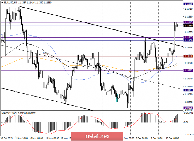 Довольно-таки сложная ситуация для входа в рынок. В приоритете покупки eur/usd, однако открывать длинные позиции на хаях, да ещё и под сопротивлением 1.1145, совсем необязательно. И это ещё мягко сказано. А вот откат к пробитым уровням сопротивления 1.1116 и 1.1110, а также к чёрной пробитой верхней границе нисходящего канала, можно рассматривать для открытия покупок.