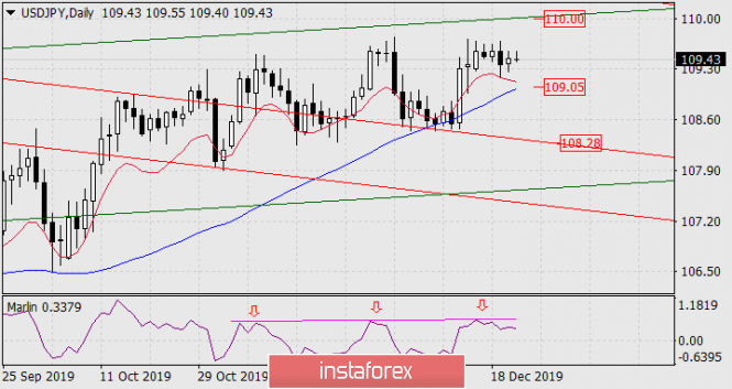 По японской йене со второй половины декабря продолжается консолидация над индикаторной линией баланса (красной) на графике дневного масштаба. По осциллятору Марлин продолжает формироваться тройная вершина как сложный вариант дивергенции. С преодолением ценой поддержки линии Крузенштерна на цене 109.05 наступит окончательный слом сопротивления «быков» и цена направится к ближайшей цели 108.28 – к поддержке вложенной линии красного ценового канала.