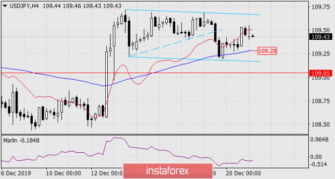 На четырёхчасовом графике 19-го числа цена вышла из формировавшегося треугольника вниз, преобразовав его в наклонную консолидацию (флаг). Поддержку цена нашла на линии Крузенштерна. Закрепление под ней (109.28) позволит атаковать линию Крузенштерна дневного масштаба (109.05). Осциллятор Марлин указывает на усиление понижающейся тенденции.
