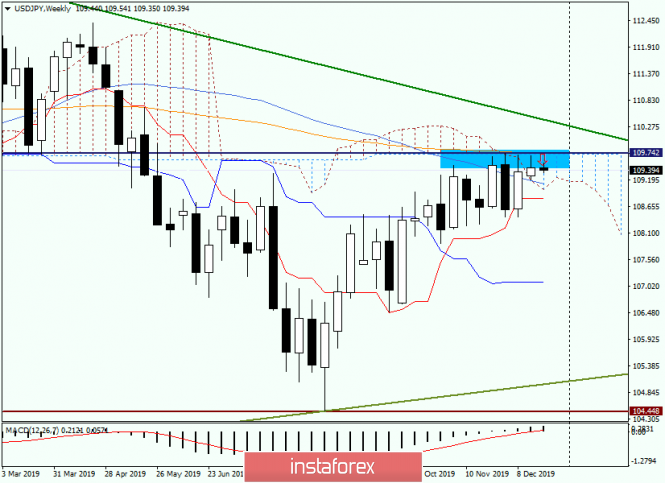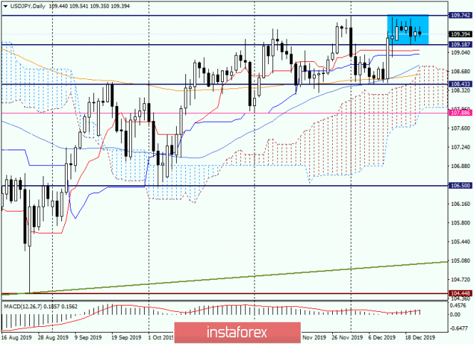На дневном графике консолидация, которая наблюдается в ценовой зоне 109.74-109.20, оставляет больше вопросов, чем даёт ответов. В таком случае после завершения консолидации возможны варианты движения в обоих направлениях. И всё же, поскольку недельный таймфрейм старше, а сигналы там сильнее, жду снижения курса usd/jpy в район 109.09-109.00, где проходят, соответственно, линии Тенкан и Киджун индикатора Ишимоку.