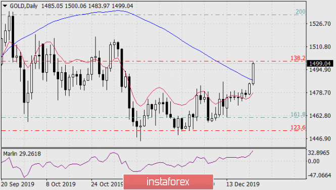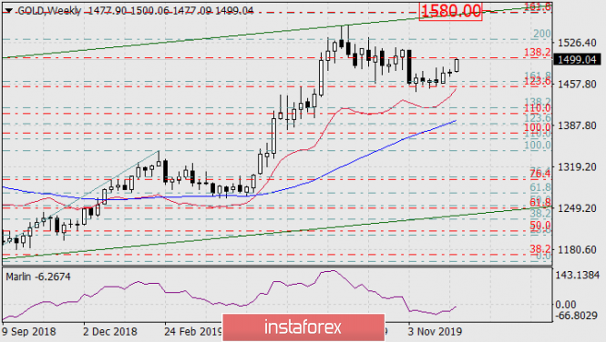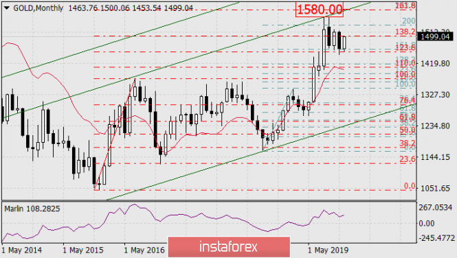 Среднесрочная перспектива по золоту до весны 2020 годаИнстаФорекс - Instaforex, 5 лет назад На графике месячного масштаба текущая свеча растёт в точности от линии Фибоначчи 123,6% красного цвета. Данная сетка выстроена по базовому движению декабря 2015-июня 2016 года. Сигнальная линия осциллятора Марлин также развернулась вверх в зоне положительных чисел. Перспективной целью роста выступает уровень совпадения двух уровней Фибоначчи: 161,8% красной сетки и 223,6% лазурной сетки, базовой ветки августа 2018-февраля 2019 года. Уровни совпадают в районе ценовой отметки 1580.00. В этом же районе цену ждёт вложенная линия глобального ценового канала, берущего начало с июня 2005 года. Цена может достичь целевой уровень за два месяца, то есть к марту будущего года.