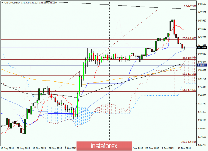 Анализ и прогноз по GBP/JPY на 25 декабря 2019 годаИнстаФорекс - Instaforex, 5 лет назад Ещё раз всем привет! Пользуясь закрытием рынков по причине празднования Католического Рождества, есть возможность рассмотреть валютные пары, которые обычно лишены внимания. Одной из таких пар, на мой взгляд, является кросс-курс фунт/иена. Те кто не первый день в рынке, прекрасно знают, что это один из самых волатильных кроссов, торгуя которым, можно не только хорошо заработать, но и прилично потерять. Признаюсь честно, в последнее время редко смотрю на графики этого инструмента, а тем более им торгую. Тем интереснее будет прямо сейчас в режиме реального времени рассмотреть дальнейшие перспективы gbp/jpy, проанализировав графики цены. Хотите - верьте, хотите - нет... Только что открыл график этого кросса, не готовился к его анализу, поэтому прямо сейчас выражу своё личное мнению на основании технических факторов. Weekly Ни для кого не секрет, что и фунт стерлингов, и японская иена в последнее время не блещут стабильным направлением ценовой динамики. Обе валюты то демонстрируют серьёзное укрепление, то вдруг оказываются под не менее серьёзным давление продаж. Как видим, недельный график кросса как нельзя лучше подтверждает такую трактовку. Вслед за внушительным ростом 126.52-147.92 началось не менее значимое снижение. Впрочем, растянув сетку инструмента Фибоначчи на обозначенное движение вверх, нисходящее направление на данный момент можно считать коррекцией к предыдущему росту. Тем не менее продолжение нисходящей динамики и пробой уровня 138.84 в значительной степени усугубят положение для быков по gbp/jpy. Окончательно говорить о медвежьих настроениях по кроссу можно будет после прохождения 50 уровня фибо от обозначенного роста. Характерно, что именно здесь пролегает линия Киджун индикатора Ишимоку, которая делает момент со снижением пары к 137.20, пожалуй, ключевым. Ключевым в плане того, что будет дальше. Если 50% фибо и Киджун отразят возможную атаку медведей, можно ждать отскока как минимум в район 139.00-139.20. Впрочем, о чём это я. Как прекрасно видно на недельной графике, внизу много сильных поддержек, прохождение которых отнюдь не гарантировано. В данный момент медведи пытаются продавить котировку ниже сильной 89 экспоненты. Получится это у них или нет - узнаем только после закрытия торгов 23-27 декабря. Но даже если 89 ЕМА будет пробита, ниже поддержку способны оказать на 140.50 обе границы облака индикатора Ишимоку, а на 139.25 50 простая скользящая средняя. Как по мне, то шансы на дальнейшее направление ценового движения примерно равны, но, по личному мнению, наиболее актуальным видится продолжение восходящего сценария. Кстати, его подтверждением станет пробой линии Тенкан 144 ЕМА и закрепление выше важного технического уровня 144.00. Daily На дневном графике картина также далека от однозначной. Обозначу ближайшие сопротивления и поддержки, после достижения которых трейдеры вправе искать варианты для открытия позиций. Сразу поясню свою мысль - имеет смысл рассматривать движение и позиционирование в обоих направлениях. Итак, продажи выглядят актуальными после подъёма котировки к 143.60 и 144.53. Именно здесь проходят линии Киджун и Тенкан, соответственно. Как представляется, ценовая область 143.50-144.50 чрезвычайно сильна и вкупе с Тенкан и Киджун могла бы оказать сильное сопротивление и разв