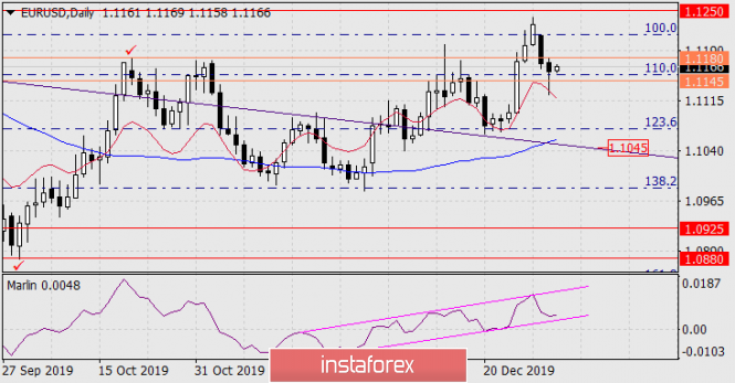 На графике daily сигнальная линия осциллятора Марлин подошла к нижней границе собственного канала, выход из которого вниз усилит падение евро. Целью движения становится вложенная линия глобального нисходящего ценового канала в районе отметки 1.1045.