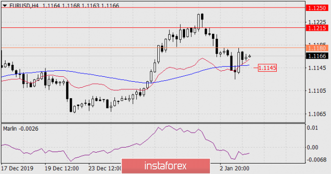 На четырёхчасовом графике в пятницу состоялся ложный уход цены под линию Крузенштерна. Осциллятор Марлин в нисходящей позиции, что склоняет цену к устойчивому закреплению под линией Крузенштерна со второй попытки. Условием к снижению евро становится закрепление цены под данной линией, ниже ценового уровня 1.1145.