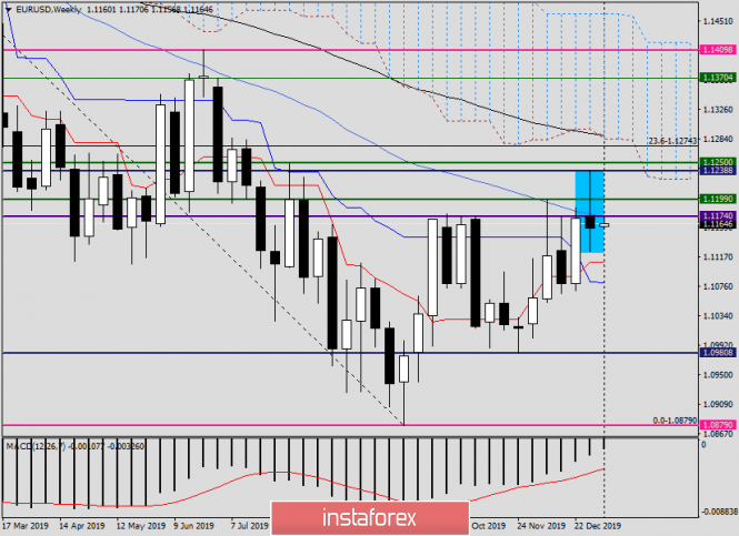 Как и предполагалось, никаких кардинальных изменений в денежно-кредитной политике в протоколах последнего заседания FOMC не содержалось. Впрочем, несколько руководителей Федрезерва настороженно отнеслись к низким процентным ставкам и их негативному влиянию на финансовый сектор страны. На фоне вероятного прорыва в торговых взаимоотношениях между США и Китаем, а также чрезвычайно низкой вероятностью выхода Великобритании из ЕС, глобальные риски смещены в сторону снижения. Главный вывод, который можно сделать из опубликованных протоколов, ФРС сохранит какое-то время ставки на текущих уровнях. В общем, всё ожидаемо и достаточно предсказуемо. Теперь пора переходить к рассмотрению графиков по главной валютной паре. В понедельник, как обычно, начинаем с недельного таймфрейма.