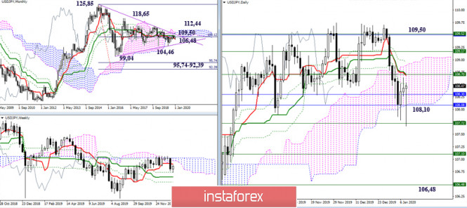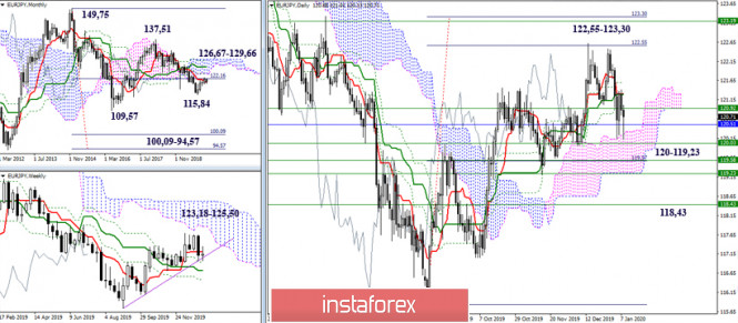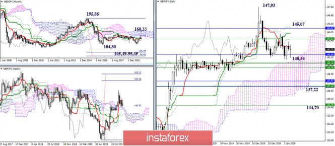 USD/JPY и её кроссы. Начало 2020 года – рекомендации технического анализаИнстаФорекс - Instaforex, 5 лет назад USD/JPY Прошлый год йена провела в борьбе с облаками Ишимоку самых старших временных интервалов (неделя и месяц). При этом в течение года ей так и не удалось ни разу добиться значимого результата, из-за чего итог года вылился в формирование свечи неопределённости. 2019 год, «Волчок» с небольшим диапазоном движения, передал в 2020 неопределённость, раздумья и борьбу, а ключевые сопротивления сохранили своё расположение. Ориентирами для игроков на повышение в 2020 году будут служить следующие рубежи 109,50 (недельное облако + месячный среднесрочный тренд) – 112,44 (месячное облако) – 118,65 и 125,85 (максимальные экстремумы, позволяющие покинуть зону неопределённости и борьбы, восстановив восходящий тренд). Для игроков на понижение ближайший интерес связан с закреплением ниже дневного облака (108,11), преодоление откроет новые возможности – исполнение нисходящей цели на пробой дневного облака и ликвидация недельного мёртвого креста (107,10 – 106,48). Далее медвежьи перспективы будут связаны с выходом из сложившейся зоны неопределённости (104,46 – 99,04) и продвижением к месячной цели на пробой облака (95,74 – 92,39). EUR/JPY Ничего значительного паре за 2019 год добиться не удалось. На старших таймах текущее преимущество сохраняется на стороне медведей, так как работа продолжается в медвежьей зоне относительно недельного и месячного облаков Ишимоку. Поддержку в настоящий момент оказывает дневное облако (120 – 119,23) и недельный золотой крест (заключительный рубеж 118,43). Закрепление ниже данных ориентиров позволит рассмотреть снижение под минимальные экстремумы 115,84 – 109,57, с дальнейшей возможностью исполнения месячной нисходящей цели на пробой облака (100,09 – 94,57). Для игроков на повышение восстановление позиций и перспектив лежит в 2020 году через преодоление следующих рубежей сопротивления – 122,55-123,30 (цель на пробой дневного облака) – 123,18-125,50 (недельное облако) – 126,67-129,66 (ликвидация месячного мёртвого креста + пробой месячного облака). GBP/JPY 2019 год пара закончила примерно на тех же позициях, что и начинала, лишь бросив за год в сторону медведей длинную нижнюю тень. В итоге можно отметить, что прежние противоречия сохранились и сформировались новые. В настоящий момент у пары на старших временных интервалах имеются разнонаправленные цели. Сейчас можно констатировать, что определённое текущее преимущество принадлежит игрокам на повышение, которые сохраняют расположение в бычьей зоне относительно облаков (дневного и недельного) Ищимоку. Выходом из зоны коррекции и восстановлением восходящего тренда послужит обновление максимального экстремума (147,93), далее интересы игроков на повышение будут направлены на исполнение повышательной цели на пробой недельного облака (152,26 – 155,12), а также на борьбу с сопротивлением месячного облака, закрепление выше которого (160,33) сформирует новые глобальные перспективы для игроков на повышение. В случае потери поддержек в районе 140,34 (недельное облако + верхняя граница дневного облака) и последующее снижение под 137,22 (месячный краткосрочный тренд) и 134,70 (заключительный рубеж недельного золотого креста) будет значительно усилены медвежьи настроения, задачей которых после этого станет восстановление месячного нисходящего тренда (124,80) и исполнени