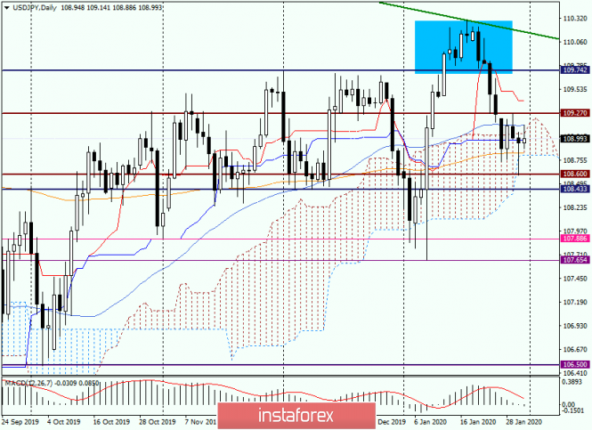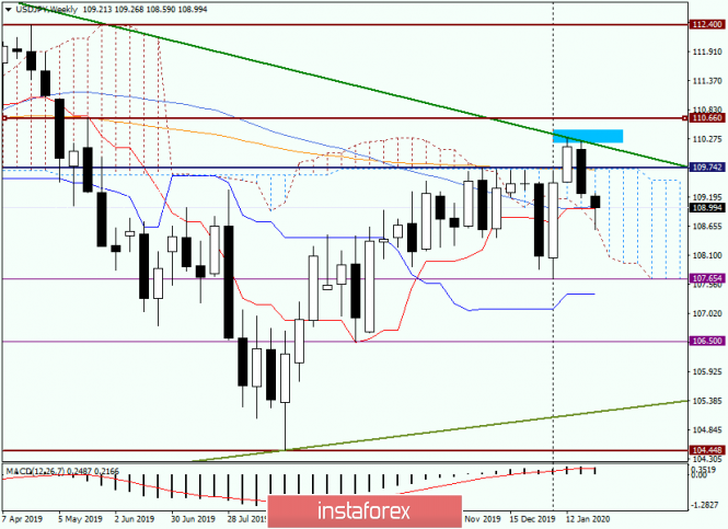 Технический анализ и прогноз по USD/JPY на 31 января 2020 годаИнстаФорекс - Instaforex, 5 лет назад Здравствуйте, уважаемые коллеги! Поскольку сегодня пятница и завершаются недельные торги, значит есть возможность обратить внимание на интересную валютную пару USD/JPY. Раньше, когда процентная ставка по доллару США была гораздо выше, эта валюта считалась рисковым активом, в то время как иена, насколько помню, всегда являлась валютой-убежищем. При тяге инвесторов к риску доллар/иена росла, а при негативных настроениях рынка снижалась. Теперь, когда в США ставка рефинансирования снижена уже трижды подряд, уже далеко не всё так однозначно, как раньше, поэтому предлагаю перейти к графикам цены и рассмотреть техническую картину по данному инструменту. Weekly На прошлой и позапрошлой неделях евро/иенам встретила сильную преграду для дальнейшего роста прямо на зелёной линии сопротивления 125.29-110.29. Таким образом, можно прийти к выводу, что данная линия была построена по правильным точкам, и это вызывает чувство удовлетворения. Но сейчас не об этом. Пока не произойдёт истинный пробой этой линии, пара будет находиться под понижательными рисками. А вот в случае пробоя линии сопротивления 125.29-110.29, откроется дорога к последующему росту, целями которого станут отметки 110.68 и 112.40. В данный момент времени usd/jpy вошла в пределы облака индикатора Ишимоку, однако дальнейшее снижение сдерживают 50 простая скользящая средняя и линия Тенкан. Как видим, на данный момент от этих индикаторов происходит сильный отскок вверх. Пока неизвестно, сколько он может продлиться (и продлится ли вообще), а также какими в итоге получатся текущая недельная свеча и цена её закрытия. Вовсе не исключено, что будет выполнена в виде разворотной модели свечного анализа, и в этом случае мы вправе рассчитывать на рост евро/иены, при этом, возможно, достаточно существенный. О нисходящем сценарии просигнализирует выход кросса вниз из облака индикаторам Ишимоку, тогда пара направится в район поддержки 107.65, от способности пробить который будут зависеть дальнейшие перспективы кросс-курса eur/jpy. Переходим на более мелкий временной промежуток. Daily Здесь картина смешанная. На вчерашних торгах пара попала в пределы облака Ишимоку, что не есть хорошо для перспектив последующего роста. Однако длиннющая нижняя тень недвусмысленно указывает на героические попытки быков по евро поднять курс и вернуть котировку в область над верхней границей облака. Немного не получилось, хотя свеча за 30 января вполне может считаться разворотной, то есть бычьей. Как раз сегодня после вчерашней свечи с огромным хвостом мы и наблюдаем укрепление курса eur/jpy. На текущий момент пара уже предпринимала попытки выйти из облака вверх, но несокрушимым препятствием является сильная линия Киджун индикатора Ишимоку. Именно она не даёт кроссу выйти вверх из облака Ишимоку и протестировать сопротивление продавцов на 109.27. Но даже пробой этой отметки не прояснит до конца ситуацию. Дело в том, что на 109.41 находится линия Тенкан, которая может оказать сильное сопротивление и развернуть цену вниз, сделав пробой сопротивления 109.27 ложным. На данный момент основной торговой идеей считаю покупки. Однако открывать длинные позиции под сопротивлениями в виде верхней границы облака и линии Киджун считаю нецелесообразным. Нужно или дождаться про