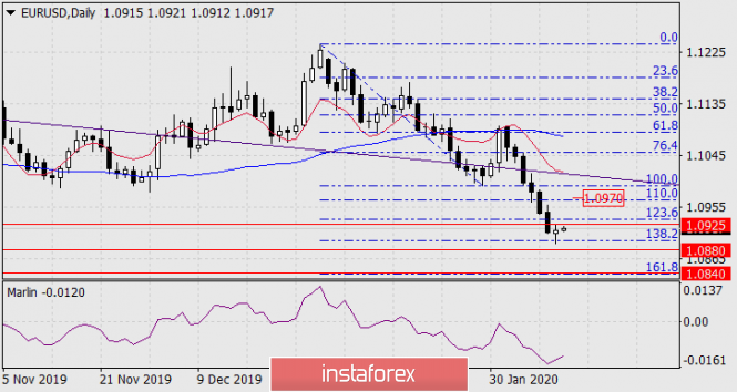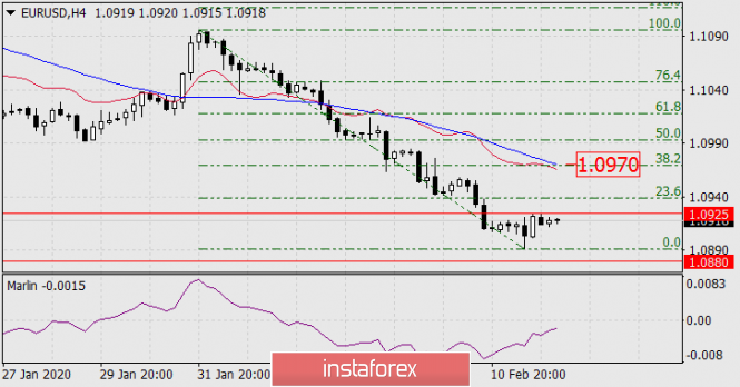 На четырёхчасовом графике цена удерживается в диапазоне 1.0880-1.0925, позволяя осциллятору Марлин разрядиться перед новой волной снижения. Возможен краткосрочный выход цены над верхнюю границу данного диапазона.