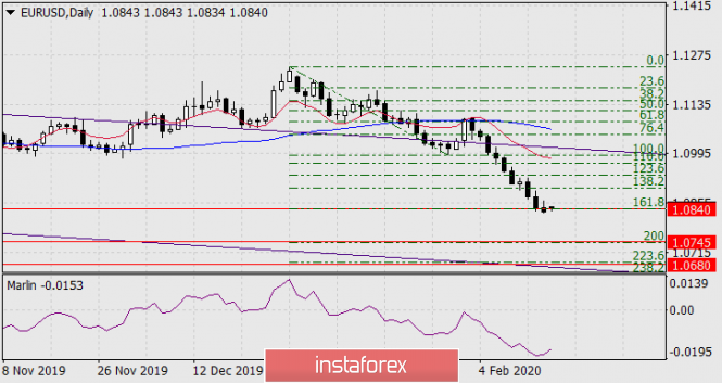 Прогноз по EUR/USD на 17 февраля 2020 годаИнстаФорекс - Instaforex, 5 лет назад EUR/USD В итоге евро снизился на 12 пунктов, преодолев поддержку уровня реакции Фибоначчи 161,8%. Следующей целью выступает уровень Фибоначчи 200,0% на цене 1.0745, далее ждём её преодоление и снижение евро ко второй цели 1.0680, в районе пересечения линии ценового канала и уровня Фибоначчи 223,6%.