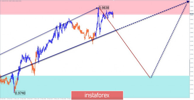 Упрощенный волновой анализ GBP/USD, USD/JPY, USD/CHF на 19 февраляИнстаФорекс - Instaforex, 5 лет назад GBP/USD Анализ: В последние полгода направление тренда британской валюты направлено на рост курса. Нисходящий участок от 13 декабря образует промежуточную коррекции. В структуре этой волны завершается подготовка к заключительному рывку вниз. Цена приблизилась к нижней границе зоны расчетного завершения. Прогноз: В ближайшие сутки котировки пары будут перемещаться между ближайшими встречными зонами. Перед окончательной сменой курса пары не исключено повторное давление на зону сопротивления. Начало активного снижения можно ждать в конце дня либо завтра. Зоны потенциального разворота Сопротивление: - 1.3070/1.3100 Поддержка: - 1.3000/1.2970 - 1.2910/1.2880 Рекомендации: При покупках фунта сегодня стоит снижать лот и быть готовым выйти из сделок при первых сигналах разворота. Основное внимание рекомендуется уделить поиску сигналов продажи инструмента. USD/JPY Анализ: С августа прошлого года направление тренда японской иены направлено на север графика. Последний незавершенный участок берет начало 8 января. В его структуре прослеживается четкий зигзаг. Цена находится у нижней границы сильной зоны сопротивления. Прогноз: Перед продолжением ценового подъема паре необходимо повысить текущий волновой уровень. Сегодня ожидается продолжение флетового перемещения цены в узком коридоре между ближайшими встречными зонами. Можно ждать нисходящий вектор. Зоны потенциального разворота Сопротивление: - 110.20/110.50 Поддержка: - 109.70/109.40 Рекомендации: Сегодня возможны продажи пары. Лот разумнее максимально снизить. Наиболее безопасно воздержаться от торговли на время коррекции. В зоне поддержки рекомендуется отслеживать сигналы покупки. USD/CHF Анализ: С апреля прошлого года основное направление тренда швейцарского франка направлено на снижение курса. Последний участок ведет отсчет с конца ноября. С середины прошлого месяца котировки корректируются вверх. Структура этого движения на момент анализа не завершена. Прогноз: Сегодня ожидается флетовый настрой движения франка. Снижение вероятно от промежуточной зоны сопротивления, не далее зоны расчетной поддержки. Возврат к ценовому росту вероятен в конце дня либо завтра. Зоны потенциального разворота Сопротивление: - 0.9830/0. 9860 Поддержка: - 0.9760/0. 9730 Рекомендации: Краткосрочный курс тренда направлен вверх, поэтому продажи пары сегодня могут быть рискованными. Более безопасно дождаться завершения отката вниз и искать сигналы покупки. Пояснения: В упрощенном волновом анализе (УВА) волны состоят из 3 частей (А-В-С). Анализируется последняя незавершенная волна. Сплошным фоном стрелок показана сформированная структура, пунктирным - ожидаемые движения. Внимание: Волновой алгоритм не учитывает продолжительность движений инструмента по времени! Материал предоставлен компанией InstaForex - www.instaforex.com |