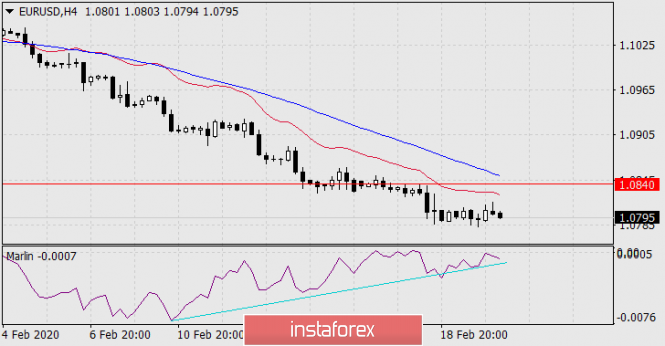 На четырёхчасовом графике двойная конвергенция по Марлину сохраняет потенциальное действие, что может выразиться в продолжении роста цены, но сигнальная линия осциллятора приостановилась на границе с территорией роста. Её уход под собственную поддержку (бирюзовая линия) нейтрализует влияние конвергенции. Это произойдёт в случае ухода цены под вчерашний минимум.