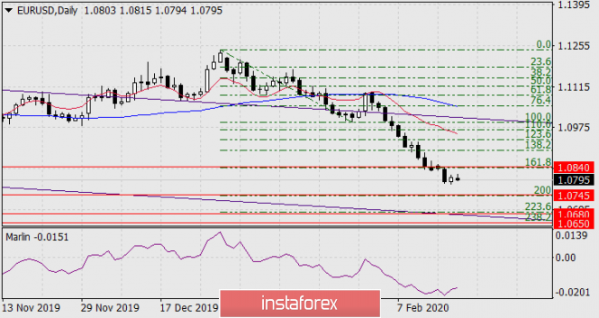 На дневном графике сигнальная линия осциллятора Марлин направлена вверх, возможно продолжение коррекции к уровню Фибоначчи 161,8% на цене 1.0840. Основные цели снижения 1.0745 и 1.0650/80 сохраняются.
