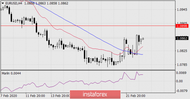 Прогноз по EUR/USD на 25 февраля 2020 годаИнстаФорекс - Instaforex, 5 лет назад EUR/USD На графике дневного масштаба цена вышла над уровень Фибоначчи 161,8% и визуально направилась к верхнему уровню 138,2% (1.0898). Сигнальная линия осциллятора Марлин вышла из собственного понижающегося канала вверх, чем усилилась локальная восходящая тенденция. В момент достижения ценой целевого уровня 138,2%, линия Марлина достигнет границы с территорией роста, здесь вероятен разворот индикатора и цены вниз, в направление основного тренда.