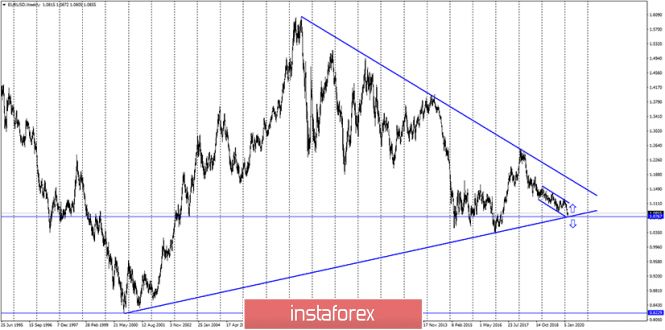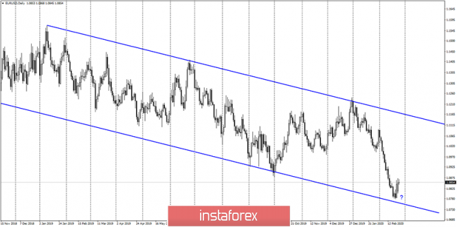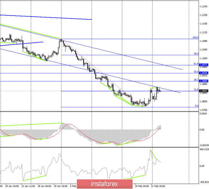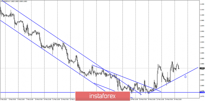 EUR/USD. 25 февраля. Краткосрочное «бычье» настроение сформировано. Медведи пока отдыхаютИнстаФорекс - Instaforex, 5 лет назад EUR/USD – 1H. Добрый день, уважаемые трейдеры! На часовом графике пара EUR/USD выполнила новый разворот в пользу европейской валюты и возобновила процесс роста после серии неудачных попыток закрытия под уровнем 1,0786. Таким образом, на самом младшем графике сложилось на текущий момент «бычье» настроение. Была образована новая восходящая линия тренда, которая теперь выступает поддержкой новому тренду. Закрытие котировок пары под этой линией сработает в пользу американской валюты и возобновления более глобального нисходящего тренда. Цели для возможных покупок евровалюты обозначены на более старших графиках. EUR/USD – 4H. На 4-часовом графике, после образования нескольких бычьих дивергенций, котировки пары выполнили рост к нижней линии нисходящего трендового коридора, ниже которого они ушли гораздо ранее. Образовалась медвежья дивергенция у индикатора CCI, которая позволяет трейдерам рассчитывать на разворот в пользу доллара США и некоторое падение в направлении уровня коррекции 0,0% – 1,0779. Закрепление курса пары евро-доллар над пиком дивергенции повысит вероятность продолжения роста в направлении уровней Фибо 38,2% – 1,0899, 50,0% – 1,0936 и 61,8% – 1,0973. EUR/USD – Daily. На дневном графике пара евро-доллар выполнила падение почти к нижней линии нисходящего трендового коридора, но не отработала ее. Таким образом, этот график позволяет предположить, что падение котировок еще может возобновиться к нижней границе коридора. Этот временной период оставляет возможности евровалюте продолжать падение. EUR/USD – Weekly. Наиболее долгосрочный график – недельный – показывает, что пара находится в стратегически важной области – около нижней границы сужающегося треугольника. Таким образом, я по-прежнему жду либо отбоя от этой линии (приблизительно уровень 1,0767) или закрытия под ним. На текущий момент можно сказать, что пара выполнила именно отбой от нижней линии треугольника. Таким образом, можно в долгосрочной перспективе рассчитывать на достаточно сильный рост евро, в область 1,1500, однако эта цель – на весь 2020 год. Обзор новостей: 24 февраля в США и Евросоюзе не выходило никаких важных новостей. Информационный фон был полностью пустым. Календарь новостей для США и Евросоюза: Германия – ВВП за четвертый квартал (09-00 GMT +2). Единственным отчетом дня является ВВП в Германии, стране с крупнейшей экономикой в ЕС. Таким образом, этот показатель достаточно важен для трейдеров. Трейдеры ожидают значения 0,4% г/г. Значение выше или ниже прогноза определит настроение 25 февраля. Отчет COT(Commitments of traders): За неделю от 18 февраля Short-позиции крупных спекулянтов увеличились до 270555, а число Long-позиций практически не изменилось (168693). Среди группы «Commercial» увеличились и Short, и Long-позиции, общее число («Total») остается в пользу Short (перевес на 36000). Таким образом, вывод: глобальное настроение трейдеров остается «медвежьим». Обеспечивается такое настроение за счет спекулянтов, потому что компании отдают предпочтение Long-позициям для хеджирования рисков при падающем в последние недели евро. В разделе «Changes» мы опять-таки видим сильное увеличение количества Short-позиций у «Non-commercial» и минимальное увеличение Long. А у группы «Commercial» растут Long-позиции, но и прибавляется количество Short. Таким обра