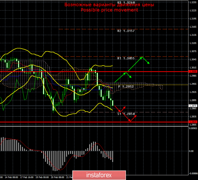 GBP/USD. Итоги 27 февраля. Американская статистика и бескомпромиссность Британии надавили на фунт стерлинговИнстаФорекс - Instaforex, 5 лет назад 4-часовой таймфрейм Амплитуда последних 5 дней (high-low): 80п – 105п – 68п – 104п – 108п. Средняя волатильность за последние 5 дней: 93п (средняя). Валютная пара GBP/USD, в отличие от пары EUR/USD, большую часть предпоследнего торгового дня недели торговалась с понижением. Так как в Великобритании сегодня не было ни одной макроэкономической публикации, а снижение котировок пары фунт/доллар началось еще на европейской торговой сессии, то можно предположить, что и здесь американские отчеты не причастны к распродажам британской валюты в течение четверга, 27 февраля. Однако все же с выходом американской статистики можно связать продолжение падения пары или, например, предположить, что трейдеры сработали на опережение и отыграли сильные отчеты заранее, хотя прогнозы были как раз достаточно слабыми. Мы же считаем, что, как и в случае с евровалютой, самой главной причиной сегодняшнего падения британской валюты является техническая. Так как технические картины у фунта и евро разные, то и движения сегодня получились разными. Фунт стерлингов продолжает находиться в так называемых «качелях» и просто опустился сегодня к минимумам от 20 февраля, не более. Трендовое движение как таковое отсутствует, хотя нисходящая тенденция все же сохраняется. Мы по-прежнему считаем, что дорога у фунта стерлингов только одна – на Юг. Поэтому, в принципе, падение котировок должно было продолжиться рано или поздно. Макроэкономический фон четверга был достаточно сильным. Все макроэкономические данные должны были поступить из-за океана, и все они оказались в итоге неслабыми. Наибольшее внимание приковывали к себе данные по заказам на товары долгосрочного использования. Основной показатель в январе показал сокращение на 0,2%, однако прогнозы предрекали снижение на целых 1,5%, таким образом, реальное значение оказалось значительно лучше ожиданий участников рынка. Более того, значение предыдущего месяца (2,4%) было пересмотрено в пользу увеличения и составило в итоге +2,9%. Второй наиболее значимый показатель – без учета оборонных и авиационных заказов – вырос в январе на 1,1% вместо +0,1% прогнозируемых экспертами. Без учета транспортных заказов показатель вырос на 0,9% при прогнозе +0,2%, а предыдущее значение было пересмотрено также в сторону увеличения с -0,1% до +0,1%. И наконец, последняя производная показателя заказов на товары длительного использования без учета оборонных выросла на 3,6% при прогнозе +1,3%. Таким образом, все четыре показателя из четырех оказались сильнее прогнозов, а два еще и были пересмотрены в сторону улучшения. Также сегодня было опубликовано предварительное значение ВВП США за четвертый квартал, которое весьма ожидаемо составило +2,1%, как и кварталом ранее. Таким образом, этот отчет получился нейтральным. Как мы уже говорили, евровалюта никак не отреагировала на эти публикации, а фунт стерлингов – просто продолжил начатое ранее падение, которое, скорее всего, продолжится сегодня. Фундаментальный фон для британского фунта сегодня также был достаточно слабым. Еще утром стало известно, что правительство Бориса Джонсона всерьез раздумывает над тем, чтобы выйти к июню из любых переговоров с Брюсселем по торговому соглашению, если не б