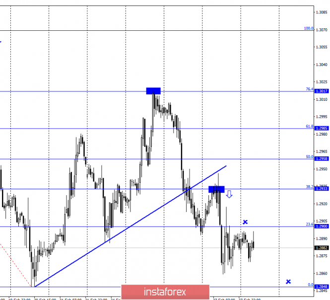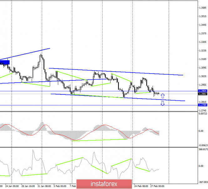GBP/USD. 28 февраля. Фунт продолжает пытаться определиться с направлением. Трейдеры ждут отчет COTИнстаФорекс - Instaforex, 5 лет назад GBP/USD – 1H. Добрый день, уважаемые трейдеры! На часовом графике пара GBP/USD выполнила отбой от уровня коррекции 38,2% - 1,2933 и разворот в пользу американского доллара с закрытием под уровнем Фибо 23,6% - 1,2900. Таким образом, остается высокая вероятность продолжения падения котировок в направлении следующего коррекционного уровня 0,0% - 1,2848, который был обозначен мною вчера в качестве второго целевого уровня. Около уровня 1,2848 можно разместить ордера Take Profit. GBP/USD – 4H. На 4-часовом графике пара GBP/USD в течение 27 февраля продолжала падение, выполнила ничего не значащее закрепление под уровнем лоу 1,2904 и теперь настроена на падение к нижней линии почти бокового коридора. Отбой котировок от этой линии позволит трейдерам рассчитывать на разворот в пользу британца и на некоторый рост вплоть до верхней линии коридора. Закрепление котировок под боковым коридором существенно повысит вероятность дальнейшего падения фунта стерлингов. Новых назревающих дивергенций сегодня не наблюдается ни у одного индикатора. GBP/USD – Daily. На дневном графике котировки пары фунт-доллар выполнили падение к нижней, нисходящей линии тренда, которую так же можно охарактеризовать, как линию поддержки. Таким образом, отбой пары от этой линии позволит рассчитывать на разворот в пользу английской валюты и некоторый рост. Пожалуй, именно дневной график сейчас имеет наибольшее значение для определения перспектив британца. Закрытие курса пары GBP/USD под линией тренда повысит вероятность дальнейшего падения в направлении коррекционного уровня 50,0% - 1,2736. Обзор новостей: В четверг, 27 февраля, в Великобритании новостей не было, а в США вышли отчеты по заказам на товары длительного использования (довольно сильные) и по ВВП (нейтральный). Фунт стерлингов, как и евровалюта, не обратил внимания на эти отчеты, тем не менее «медвежье» настроение трейдеров соответствует характеру этой информации. Календарь новостей для США и Великобритании: США – Изменение уровня расходов и доходов населения (15-30 GMT +2). Важных отчетов сегодня не будет, но можно обратить внимание на информацию по доходам и расходам американцев за январь. Однако я не считаю, что трейдеры будут отрабатывать эти данные. Отчет COT(Commitments of traders): Последний отчет COT сводился к тому, что между общим числом Long и Short-позиций было практически полное равенство. Так как пара фунт-доллар продолжает торговаться внутри бокового коридора на 4-часовом графике, то уже можно сделать вывод, что расклад сил между трейдерами-быками и трейдерами-медведями не особо поменялся. Тем не менее новый отчет COT может задекларировать изменение количества открытых позиций у крупных игроков рынка, что поможет определить вероятность выхода котировок пары из бокового коридора. Не пропустите анализа нового отчета COT после обеда. Прогноз по GBP/USD и рекомендации трейдерам: Торговая идея на 28 февраля заключается в продажах фунта стерлингов с целью 1,2848. Дальнейшие торги будут зависеть от новых торговых идей и сигналов, которых пока нет, а также от отчета COT. Паре необходимо покинуть боковой коридор или выполнить отбой от его нижней линии. ТЕРМИНЫ: «Non-commercial» - крупные игроки рынка: банки, хедж-фонды, инвест-фонды, частные, крупные инвесторы. «Commercial» - комме